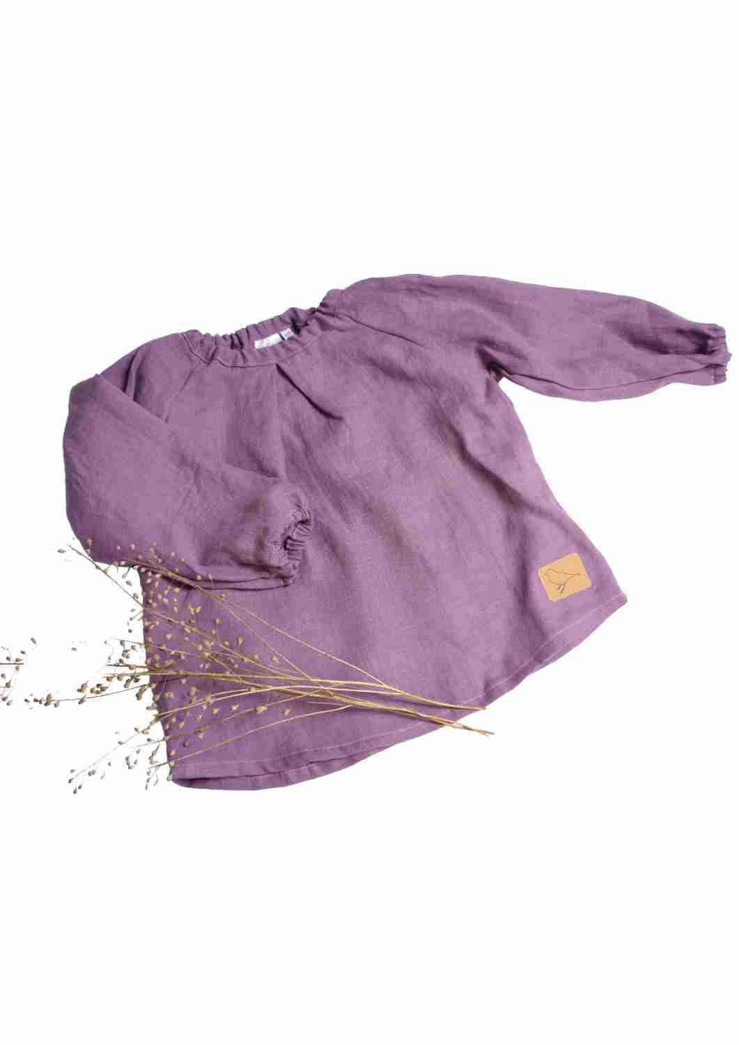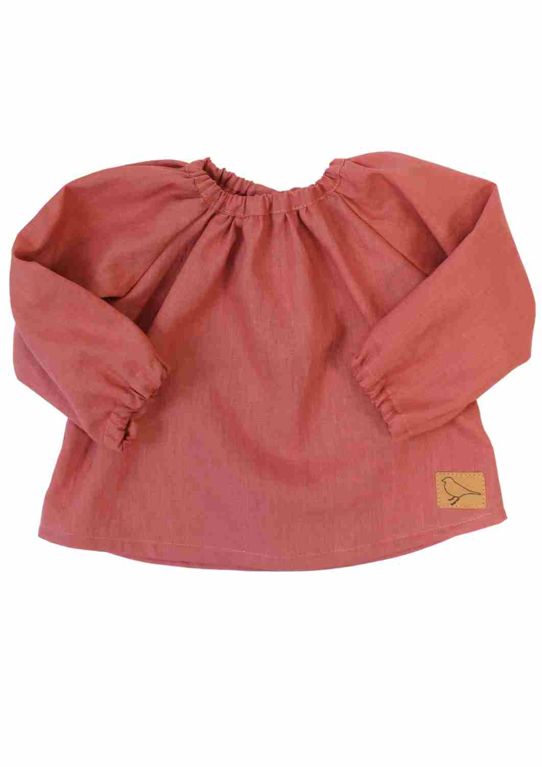 Hals- und Ärmelabschluss sind sanft gerafft und elastisch, sodass die Bluse ganz unkompliziert über den Kopf gestreift werden kann. Sie sitzt bequem, ohne einzuengen, und wächst durch ihren lockeren Schnitt ein Stück mit.